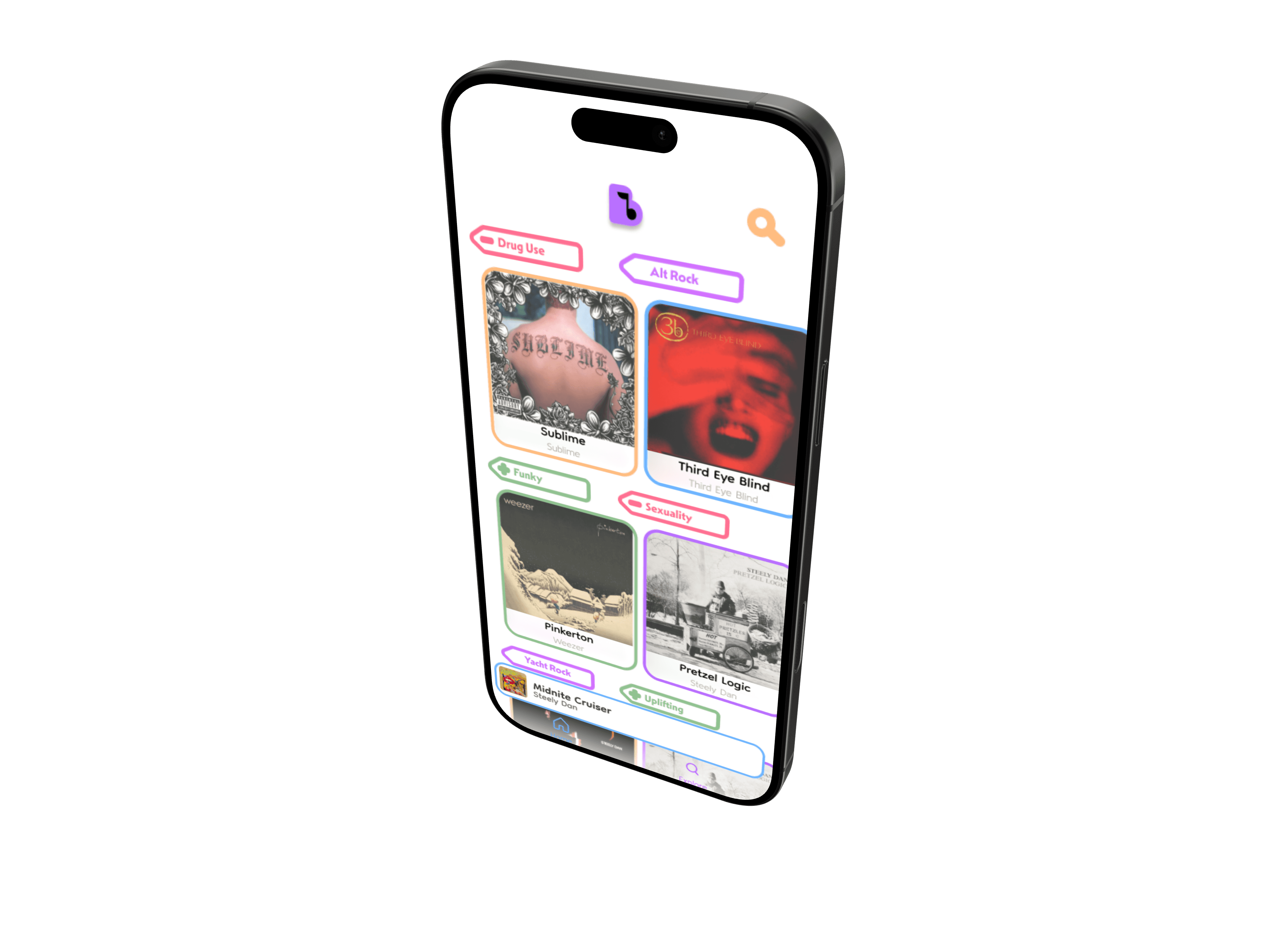 My first concept was the home page, featuring songs and albums sorted by positive, negative, and genre tags recommended based on inputted user preferences