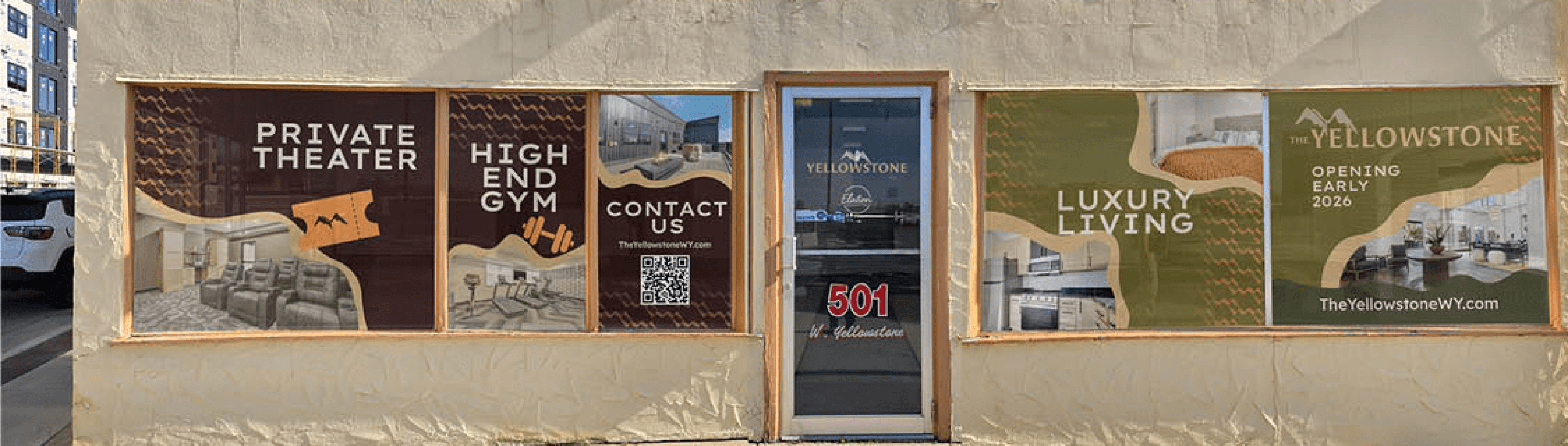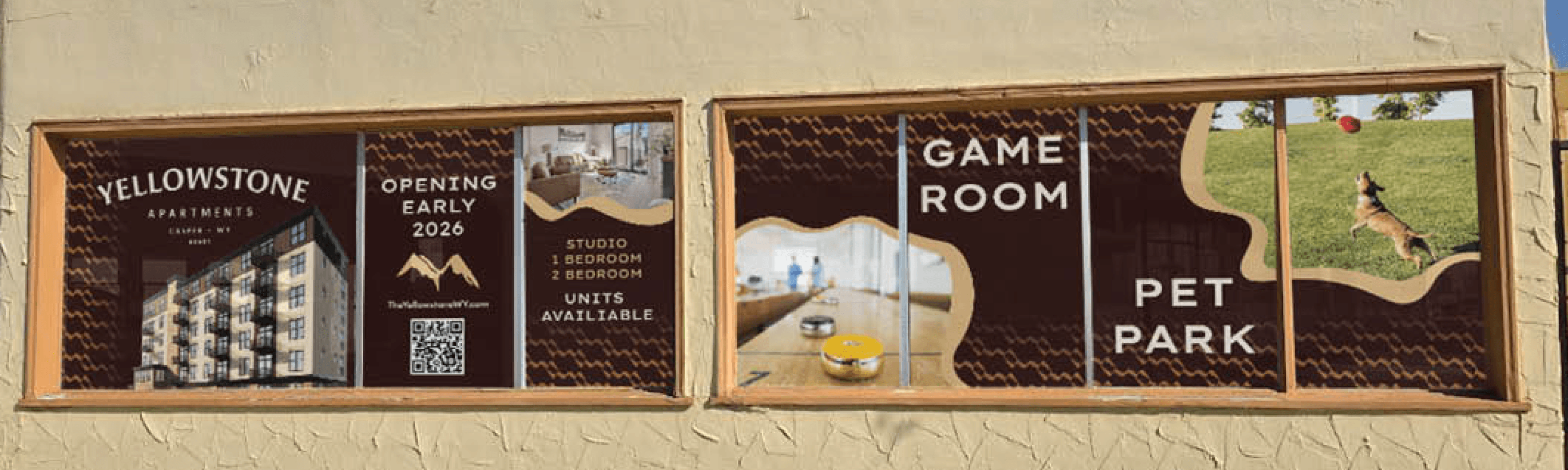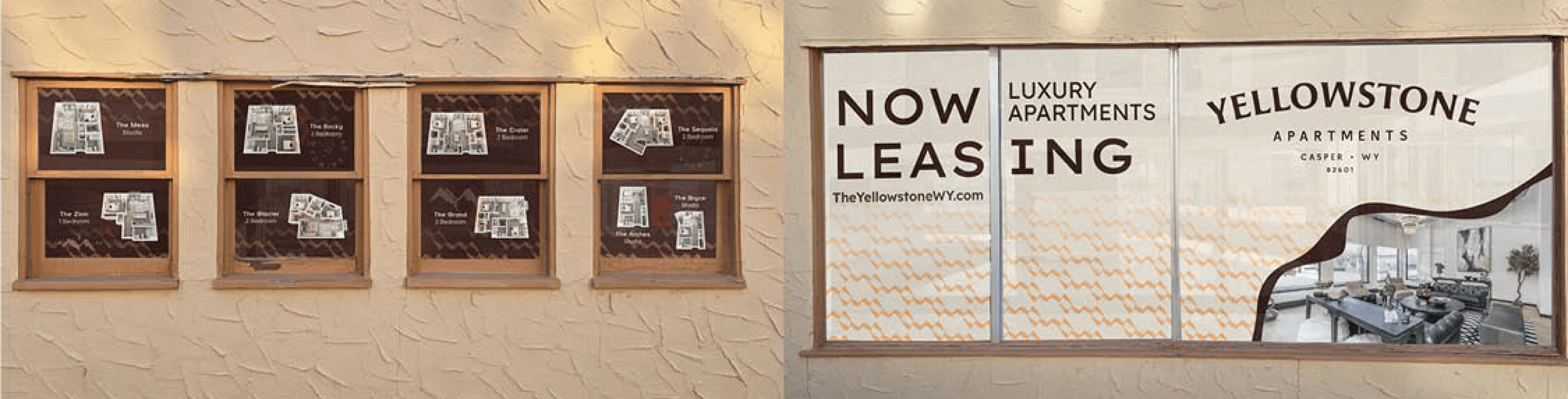The Yellowstone is another of Elation’s new properties opening up in Wyoming. When we opened our regional office in Casper, I was tasked with making these window clings to promote leasing. These are currently displayed on our office situated across the street from the prospective building. I've mocked them up on the right.