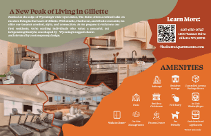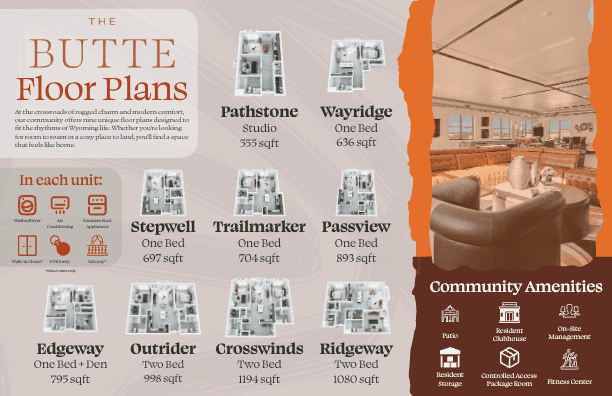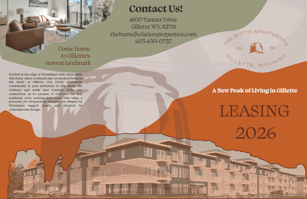 The Butte is one of the company's newest properties, beginning the expansion into Wyoming in 2026. With this being a newer brand to work with, I had to realize a lot of the branding in a transition period where the marketing director left our company. On the left you can see examples of a flyer and a couple mailers I made for this property. After much thought on how to display this brand, I ended up using silhouettes of natural curves formed on buttes and mountains that would be surrounding this property in Gillette, WY. Working with this property helped me a lot with creating cohesive elements within a brand.